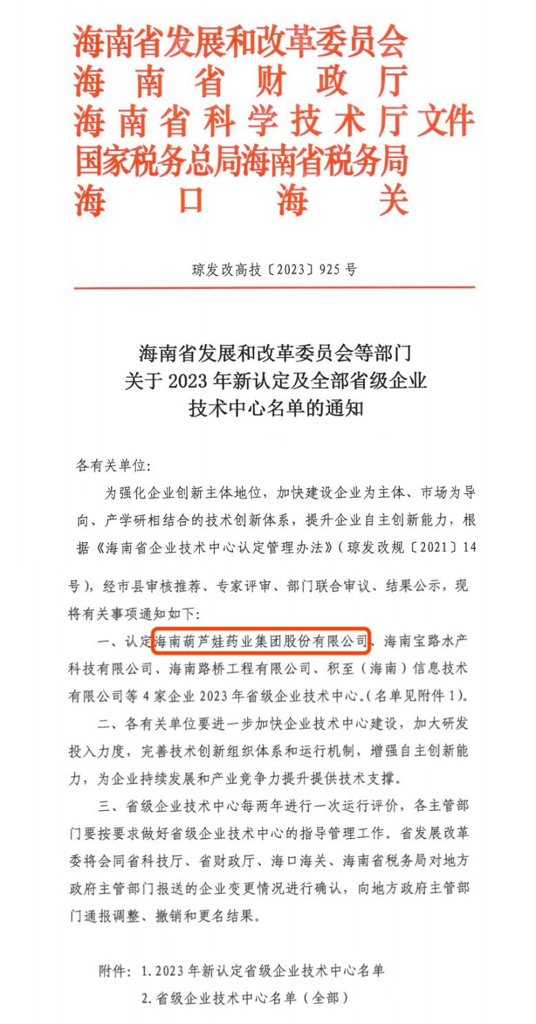 近日,海南省发改委等多部门联合公布了《关于2023年新认定及全部省级企业技术中心名单的通知》,其中,海南PA旗舰厅药业集团股份有限公司成功通过评审,被认定为省级企业技术中心,是本次获批的4家企业之一。